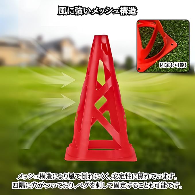 【軽量で持ち運びに便利】軽くてコンパクトなため持ち運びも楽々!サッカー・陸上競技・自転車競技・スケボーなど幅広いスポーツにご活用いただけます。コーン一式が収納できるメッシュバッグが付属するため、移動や片付けの際にも便利にお使い頂けます。
