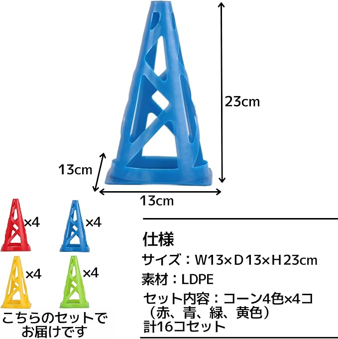 【踏んでも割れない】柔らかいポリエチレン仕様、誤って踏んでも割れず、潰れても素早く元に戻ります。怪我の心配も少なく、安心してご使用いただけます。風に強く、優れた安定感を提供するメッシュ構造と四隅の穴は、ペグを使用して固定する際にも便利です。 【目立つカラー&コンパクトに収納】4つの目立つカラーバリエーションで、はっきりとした識別が可能なマーカーコーンです。軽量な設計で、持ち運びが簡単でお子様でも楽に運べます。重ねて収納可能なため、コンパクトに収納し、省スペースで保管できます。 【様々な用途に】サッカー、フットサルや陸上競技などの練習はもちろん、バスケ、ローラースケート、スケボー、バイクやテニスなどにも適します。 体育の授業やスポーツクラブでのご使用やラジコンのコース練習やアジリティトレーニングなどアイディア次第で様々な用途にご活用いただけます。 【仕様】サイズ:W13 D13 H23cm、素材:LDPE セット内容:コーン4色(赤、青、緑、黄色) 4コ 計16コセット
