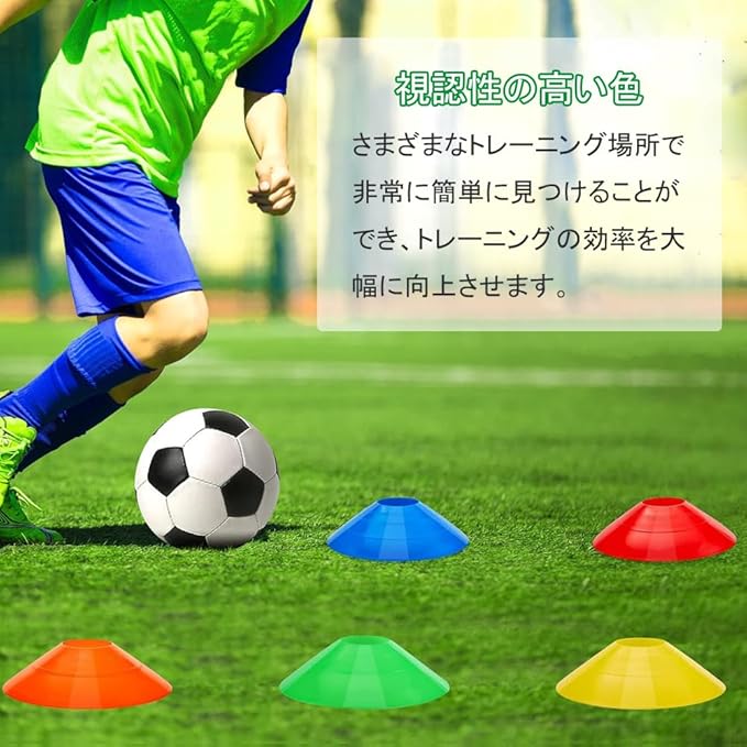 ★【商品仕様】サイズ:直径19cm 高さ5cm、マーカーコーン*10個 (赤、青、黄色、緑、オレンジ各2個)+収納袋*1個+専用スタンド*1個、数量:12個入り、重量:約262g。
