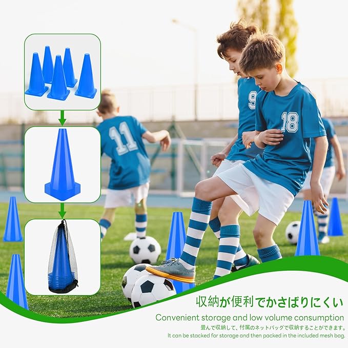 BiAnYC 10本セット 32cm マーカーコーン 青,カラーコーン ミニ,ミニコーン,サッカー コーン,三角コーン ミニ, サッカー 野球 テニス フットサル 練習コーン,ボールスポーツ 団体競技や部活 陸上競技 運動会 スポーツコーン, 収納袋付き