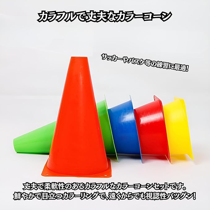 【カラフルで見やすいカラーコーン】カラフルで目立つソフトカラーコーンセットです。遠くからでも見やすい鮮やかなカラーリングで、視認性に優れております。軽量・コンパクトで持ち運びしやすく、柔軟性のある素材のため思う存分練習にお使い頂けます。