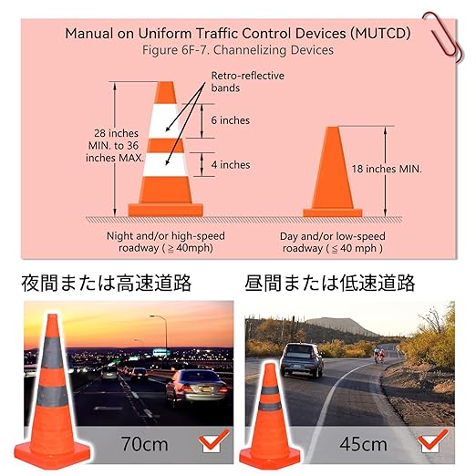 【高視認性|昼夜・悪天候対応】三角コーン LZ02 Proは、MUTCD規格に準拠した明るい蛍光オレンジと、2本の高輝度シルバー反射ストライプを採用。昼夜や悪天候を問わず遠くからでも視認しやすく、車両のライトを確実に反射して、ドライバーや歩行者の安全をサポートします。