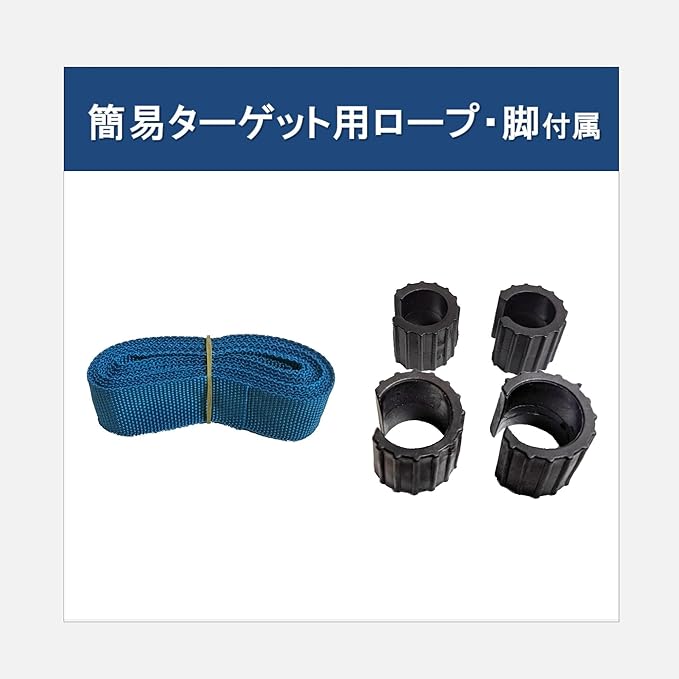 ゴムフックが地面に擦れて切れてしまうのを防止する脚と簡易ターゲット用のロープが付属しています。 簡易ターゲット用ロープはお好きな長さに切っていただくなど、ご使用状況に合わせてご自由にご使用ください。