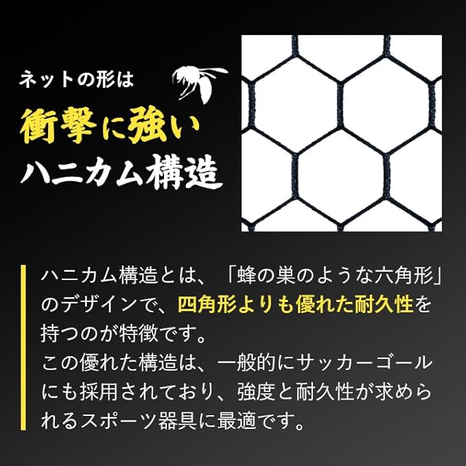 【丈夫な設計】⚾耐久性も抜群。「頑丈さ」にこだわった、剛性に優れたネットを採用。毎日使用しても、長くご愛用いただけます。また、ネットの形は衝撃に強い「ハニカム構造」です。ハニカム構造は、蜂の巣のような六角形のデザインで、四角形よりも優れた耐久性をもつのが特徴です。一般的にサッカーゴールでも採用されており、強度と耐久性が求められるスポーツ器具に最適なのです。