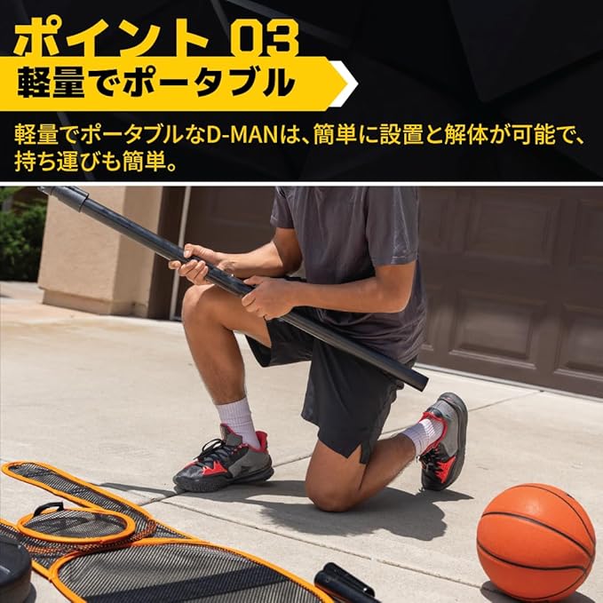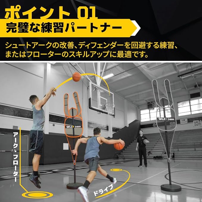 ハンズアップディフェンス: 練習ダミーが手を上げた状態で設置されるため、広いディフェンス範囲がカバーされた状況下でシュートやパスの練習を可能にします。D-MANはオフェンスで必要なドリブル、ボールハンドリング、シュート、パスのスキルを磨くのに役立ちます。
