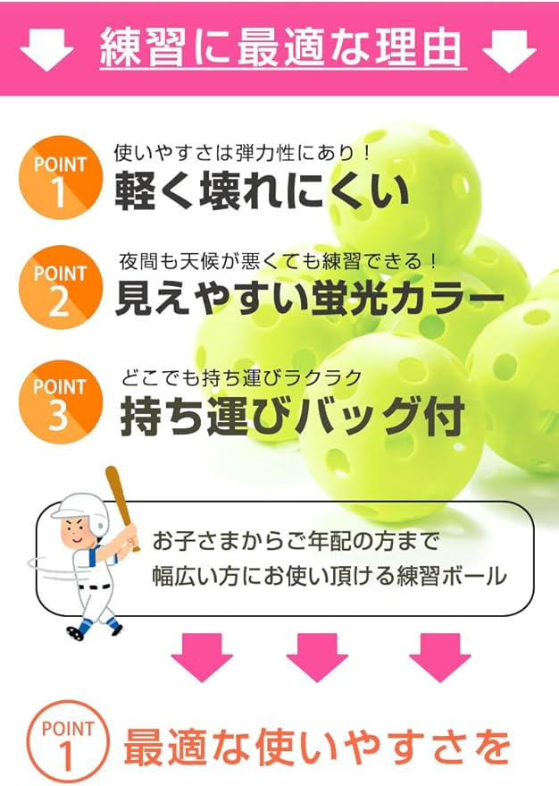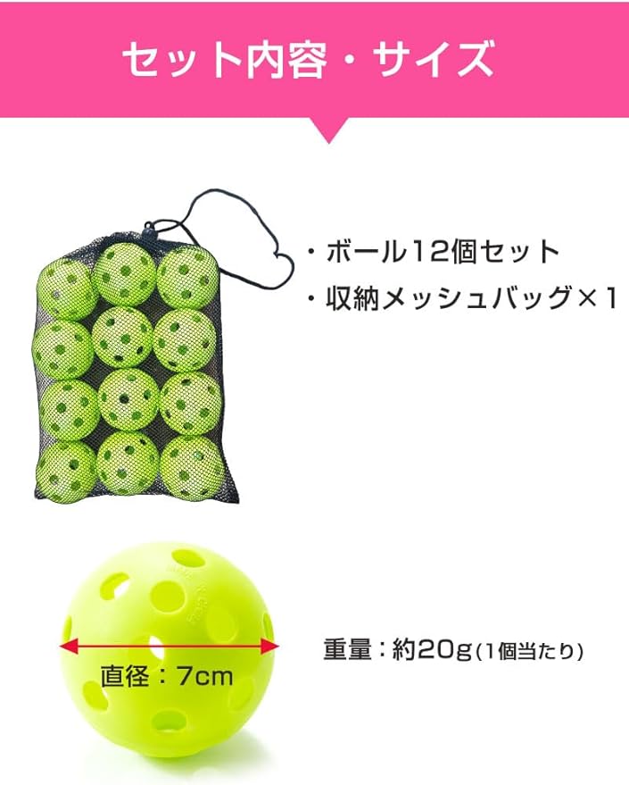 【商品のポイント】1.軽く壊れにくい素材を採用!使いやすい程良い弾力性があるボール。 2.見えやすい蛍光カラー 夜間でも天候が悪くても視認性が良い! 3.野外用と屋外用に分けても大丈夫、持ち運びバッグ2個付き! 4.柔らかいボールはケガの心配が少なくお子さんも安全に練習できます。