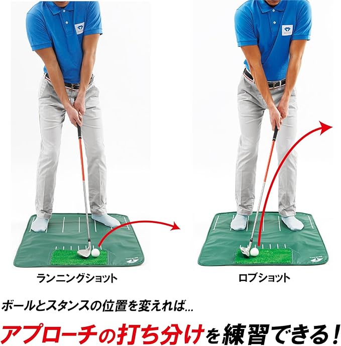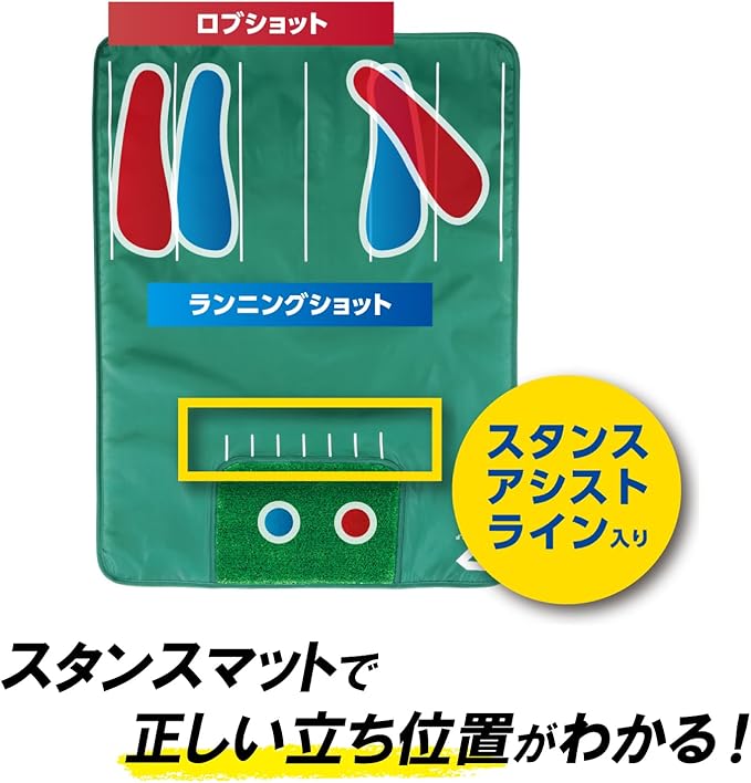 スタンスマットのアシストラインに合わせて、スタンスの幅とボールの位置を変えることで、ロブショットとランニングショットが練習できます。