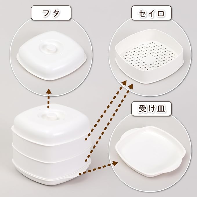 【商品仕様】:サイズ/縦156 横175 高さ131mm、カラー/ホワイト、内容/1個、セット内容/受け皿・フタ・セイロ 2、容量/300ml、耐熱温度/140℃(食洗機OK)、耐冷温度/-20℃、材質/ポリプロピレン(銀イオン無機系抗菌剤練り込み)、生産国/日本