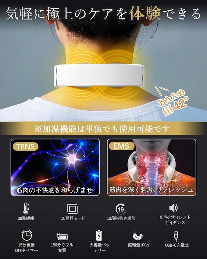 【10種類のモード・強さ19段階・加温機能】ネックケアはプロの技を再現した10モードのネックリラクゼーション(EMSとTENSが同時作動)を搭載しており、家にいながら充実したリラクゼーション体験を楽しむことができます。19段階の強度調節が可能で、お好みのモードと強度を自在に組み合わせることができます。(初めての方は、強度レベル1から始め、慣れてきたら徐々に強度レベルを上げていくことをおすすめします)。また、加温機能も搭載しており、首元のトータルケアも可能です。加温機能は単独でも使用でき、寒い日にはネックウォーマーとしてもお使いいただけます!