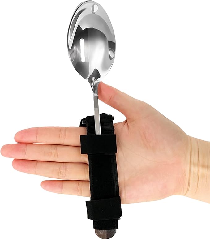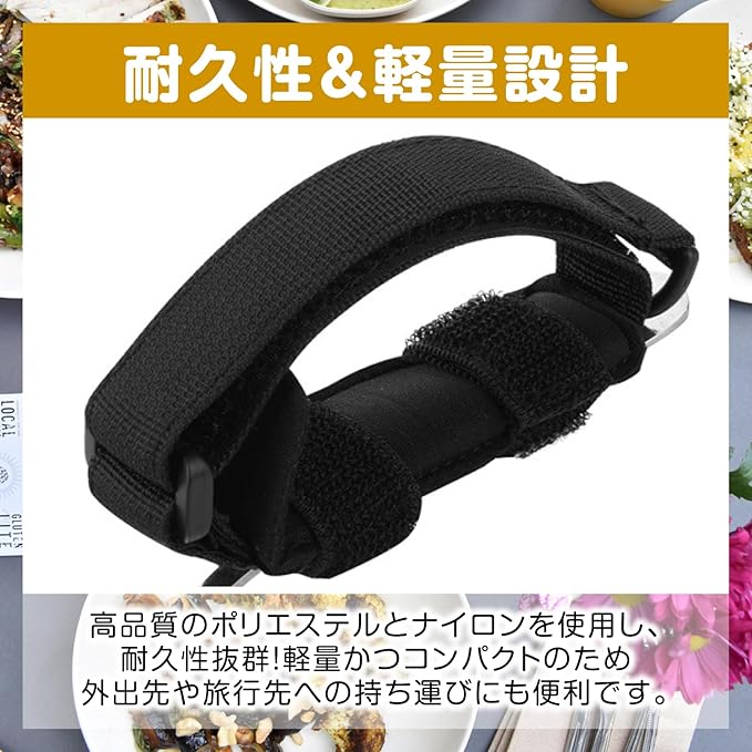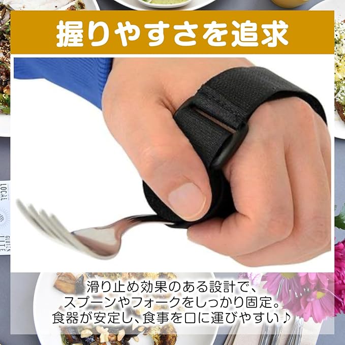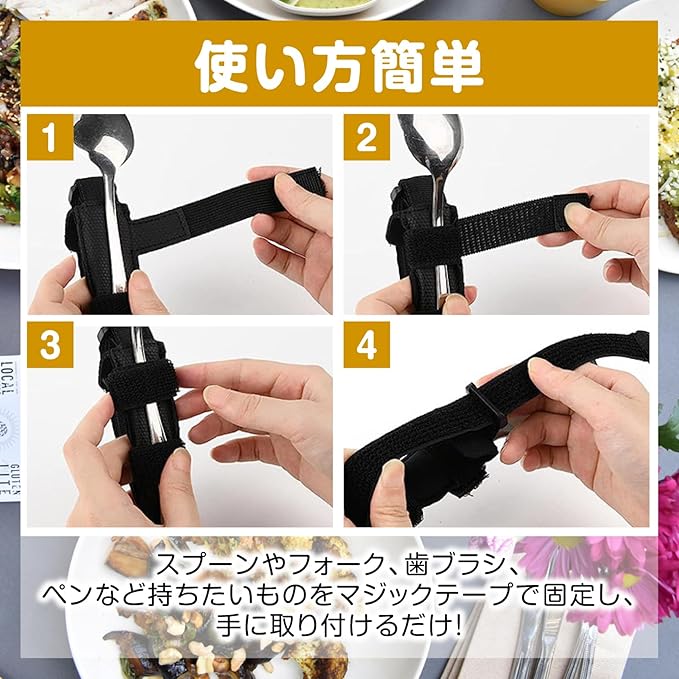 【使い方簡単】スプーンやフォーク、歯ブラシ、ペンなど持ちたいものをマジックテープで固定し、手に取り付けるだけ!調節可能ストラップで、手にしっかりフィット!通気性が良く、柔らかな触り心地です。