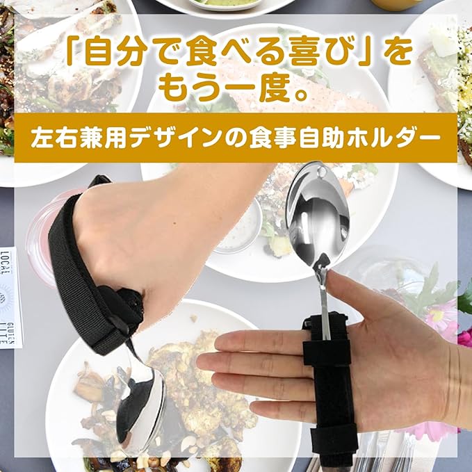 「自分で食べる喜び」をもう一度。左右兼用デザインの食事自助ホルダーです。お手持ちのスプーンやフォークなどを取り付けるだけ♪握力が弱い方や介護が必要な方の「自分で食べる」をサポートします。
