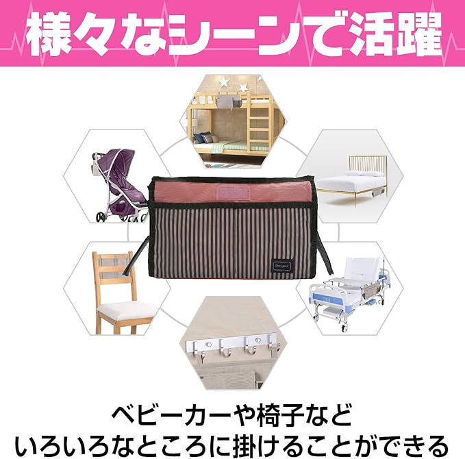 取り付けはかんたん。付属のベルトでベッド柵にとりつけるだけ。ベルトは、手提げかばんの持ち手として使用も可能。持ち運びもできる、収納ポーチです。