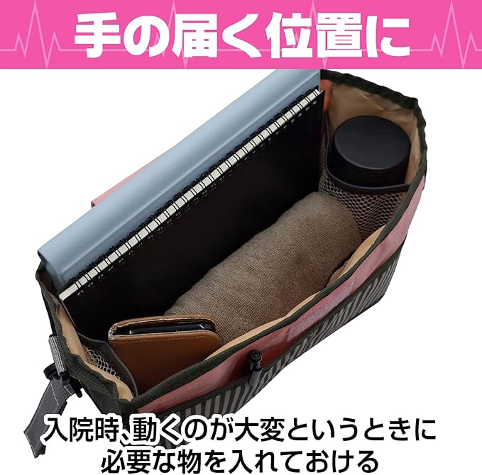 入院時のプチストレスを解消!ベッド周りの小物類を、きちんと収納できるポーチです。体が思うように動かなくて、サイドテーブルまで手が届かない・・・そんなシーンに大活躍!