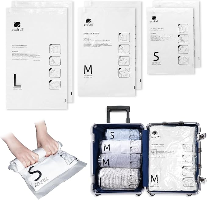 pack all 圧縮袋 衣類圧縮袋 手巻き式 省スペース 再利用可能 高密封性 ポンプ不要 防塵 防湿 防カビ 旅行 出張 家庭 引越し 衣類収納 便利グッズ 6枚組(S 2: 46 x 32.5cm、M 2: 60 x 40cm、L 2: 69 42cm)