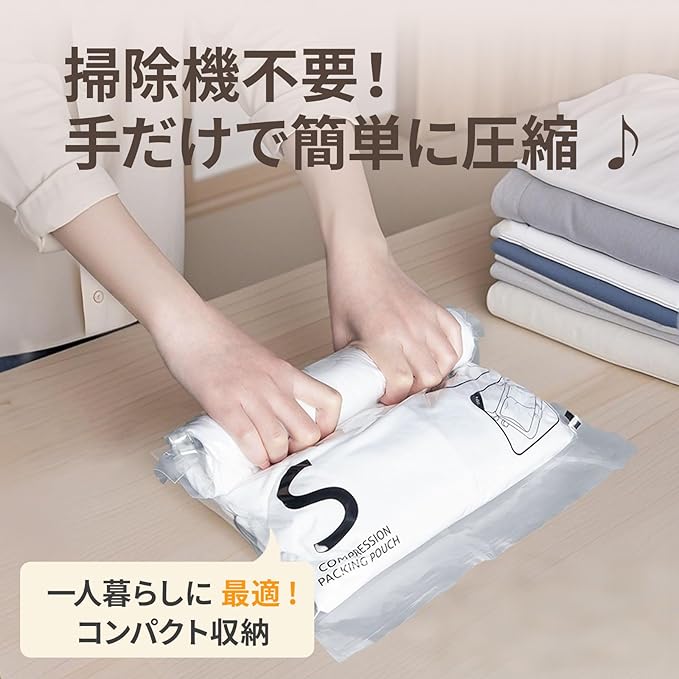 【クルクル巻くだけ!】素手で袋をクルクルと巻くだけで空気が抜け、簡便な圧縮が実現。一方通行の排気ポートの特殊設計により、圧縮後も空気が漏れません。掃除機はいらずなので、旅行先や出張先でも使えます。最大80%のスペースを節約し、旅行をより楽にします。
