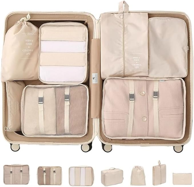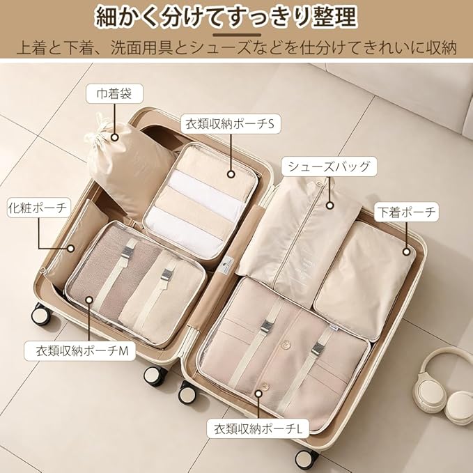 【トラベルポーチ7点セット】衣類収納ポーチ 3、シューズバッグ 1、巾着袋 1、化粧ポーチx1、下着ポーチx1。着ていない服や汚れた衣類、洗面用具やシューズなども分けて衛生的に収納できます。