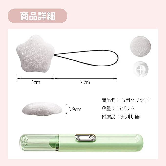 【針のない設計】糸を使って以前の長い針のクリップを代わりにすることで、布団を挟む際の異物感を効果的に減らし、針が布団やシーツを引き裂く可能性を防ぎます。そのため、肌や寝具に針が刺さる心配はありません。