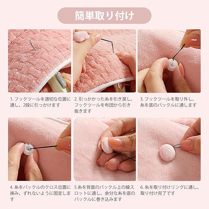 【簡単に取り付けられます】針を布団の下から通し、糸で針を挟んで布団を通し、最後に糸をボタンに固定して締めるだけです。誰でも簡単に取り付けや取り外しができ、道具が付属しています。