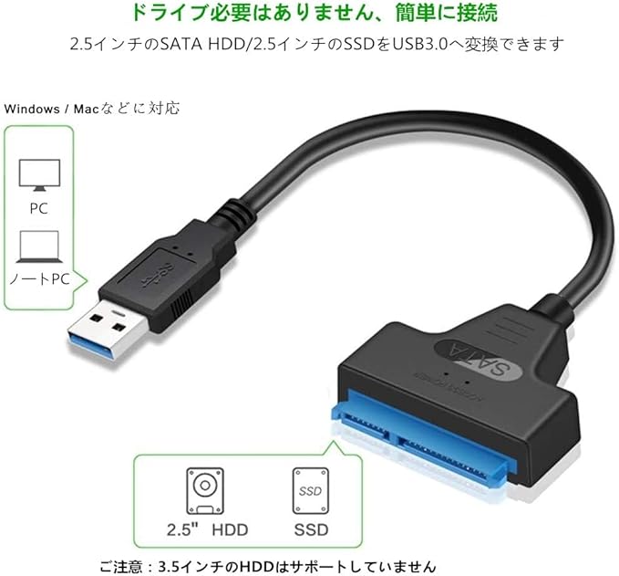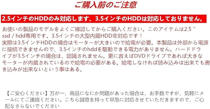 【ご注意】 2.5インチのHDDのみ対応します、3.5インチのHDDは対応しておりません。お使いの製品のモデルをよくご確認してからご購入ください。ハードドライブが3.5インチの場合は、認識されません。 商品をパソコンに接続する前に、USBインタフェースの駆動を最新バージョンにアップしてください。ハードディスクに接続する時、USB 3.0ポートに接続してください。USB 3.0の電流はアメリカb 2.0の電流の2倍です。もしUSB 2.0インターフェースに接続すると、電気が不足しているため、ハードディスク接続後に繰り返し切断して認識します。識別しない場合もあります。