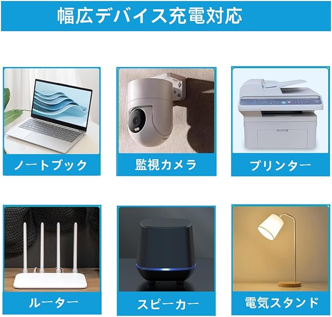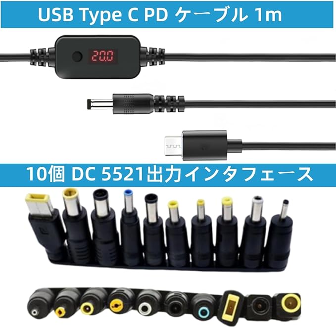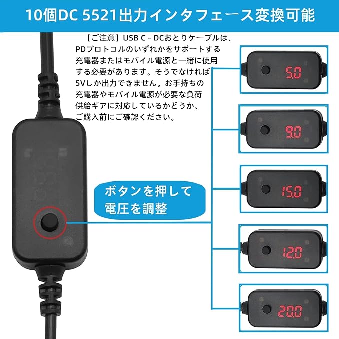 【操作簡単】ボタンを押して、出力電圧を5V/9V/12V/15V/20Vの間で切り替えます。電源供給ケーブルは長さ1mです。十つの変換コネクタがあるので、ほとんどのデバイスを充電できます。