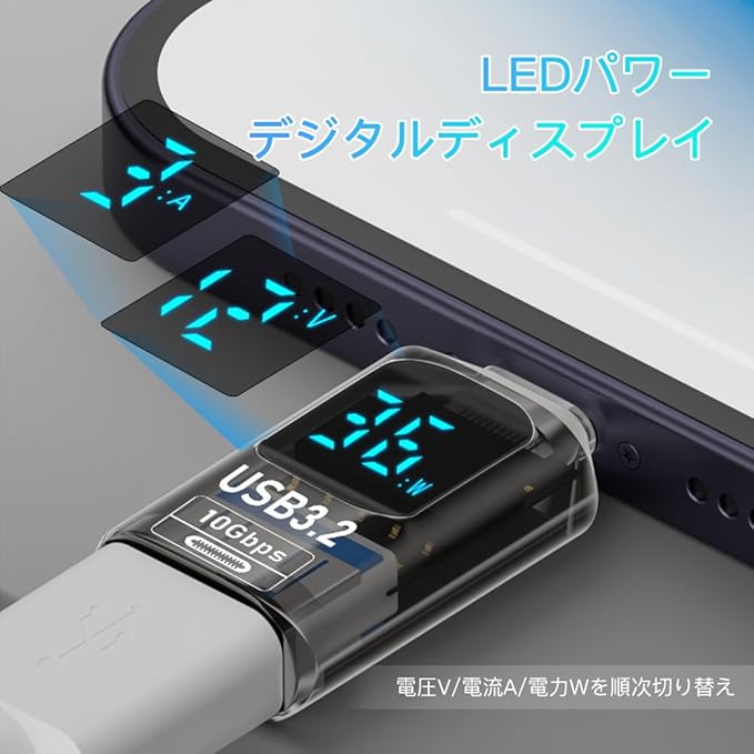 本製品を使えばLEDディスプレイ表示で充電状態が一目でわかります。電圧や電流のデジタルアダプターと比較し て、電力のデジタルは充電速度をより直接的にそして理解しや すいように教えてくれます。
