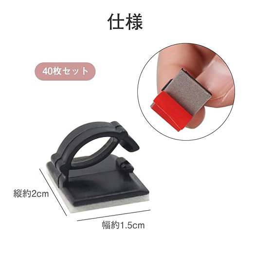 ケーブル固定具 ケーブルクリップ コードクリップ 収納 40枚セット 粘着シート付 接着式 コード管理 ケーブル収納 コードフック 配線隠し 車用 事務室用 家庭用 (黒色)