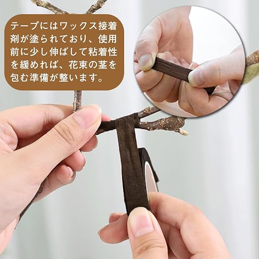 ◇テープにはワックス接着剤が塗られており、使用前に少し伸ばして粘着性を緩めれば、花束の茎を包む準備が整います。