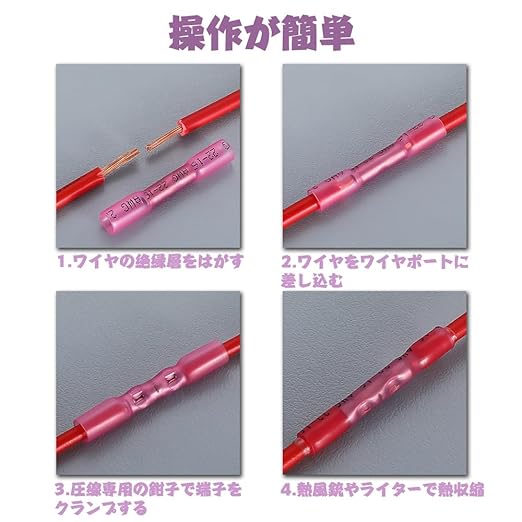 ◇材質:収縮チューブ:高密度ポリエチレン、裸圧着スリーブ:無酸素銅(C1020)。受熱温度:耐熱範囲:-55℃-125℃、収縮率3:1、収縮開始温度80℃、完全収縮温度130℃、防水、防油、防じん性能。