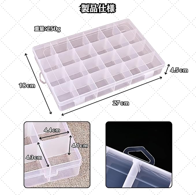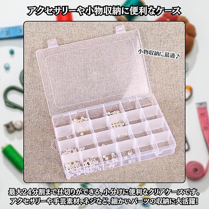 【アクセサリーや小物収納に】最大24分割まで仕切りができる、小分けに便利なクリアケースです。ピアスやイヤリング、指輪などのアクセサリー・小物収納に大活躍!ビーズやボタン、ネジや釘など、細かいパーツの収納ケースとしても最適です。