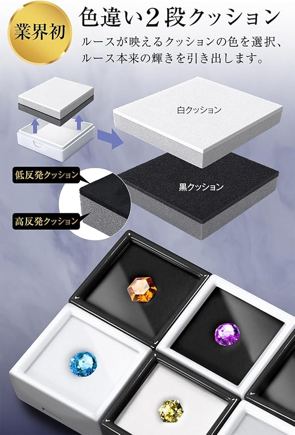 ✅ 業界初 白黒 2段クッション : 様々なルースの収納にこれ一つ。白色ケースで黒色クッションや黒色ケースで白色クッションなど、宝石の色味に合わせてルースケース内のクッションの色をカスタマイズ可能です。