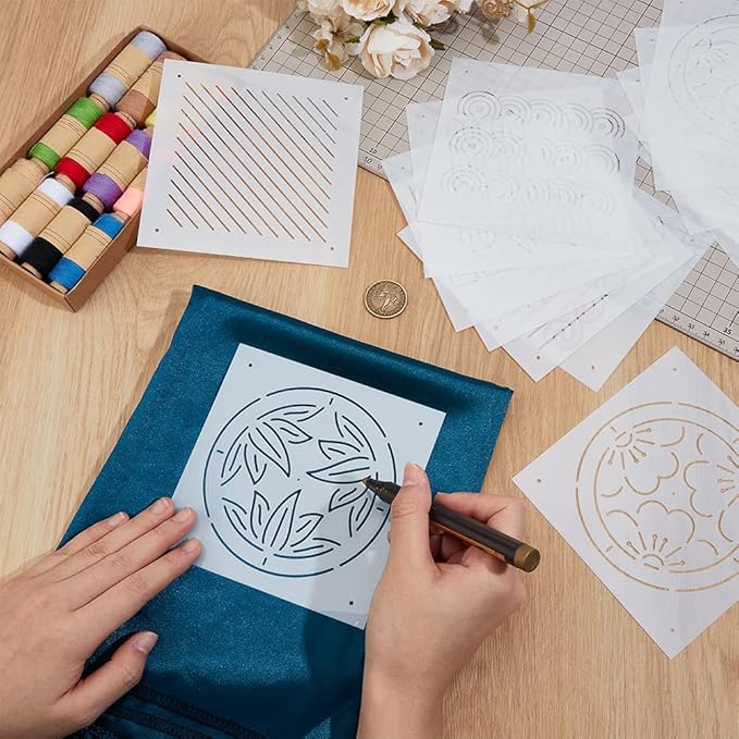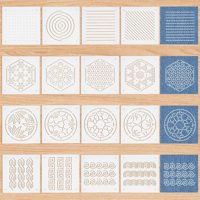 BENECREAT 16枚 刺繍ステンシル 13x13cm 厚さ0.3mm 刺し子ステンシル 点と糸・六角形・日本風パターンなど16スタイル PET 描画線テンプレート 刺し子テンプレート 刺繍ツール ハンドキルティング用