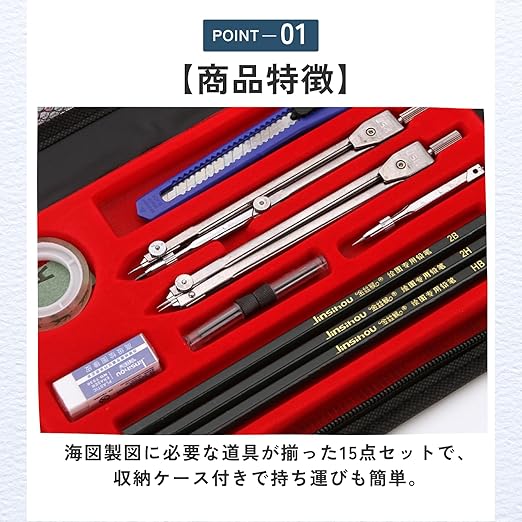 【商品特徴】海図製図に必要な道具が揃った15点セットで、収納ケース付きで持ち運びも簡単。