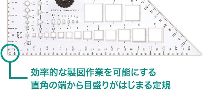 一級建築士試験合格者の声を集約したツール。つまみを持ってテンプレートをクルクル回し、素早く製図を描くことができます。3mmの厚みによって平行定規の下にもぐらずスムーズに図形が描けます。効率的な製図作業を可能にするために直角の端から目盛りが始まります。※建築士試験場で使用不可になった報告はありませんが、念の為に従来のテンプレートもご持参ください(バンコ202-80等)寸法:縦150 横150 厚3mm本体材料:透明アクリル樹脂断面:テーパーエッジ縮尺:1/100、1/200製造:日本