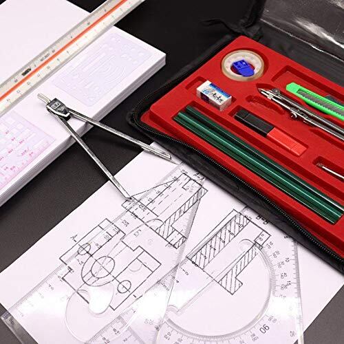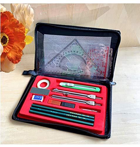 セット内容:大型三角定規、大型デバイダー 、大型コンパス 、鉛筆(2H,2B,HB) 、消しゴム、テープ、カッターナイフ 他。