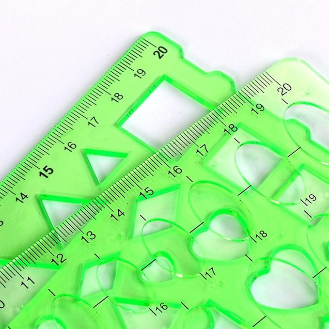 【幾何尺テンプレート】4つの緑色の幾何尺テンプレートを含み、良質なプラスチックで作られ、耐久性があり、軽量で、六角形、円形、楕円形、楕円形、三角形などの様々な形状があり、学校やオフィスで使用するのに適した異なる図案を描くことができます。