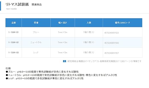 <br>●測定項目:酸性<br>●型番:ブルー<br>●pH8.0~5.0の範囲で青色試験紙が赤色に変化すれば酸性<br>●幅 長さ:7mm 5m<br>●入数:1箱(1巻入)