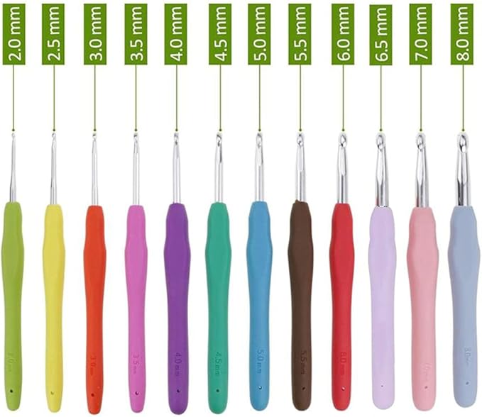 【12本編み針が入り】錆びないアルミフックヘッドです。編み針のハンドルに数値表記が付いてます。針孔が大きいため、針先から糸がはずれにくく、目を拾ったり、糸を引き抜きやすい針先形状です。