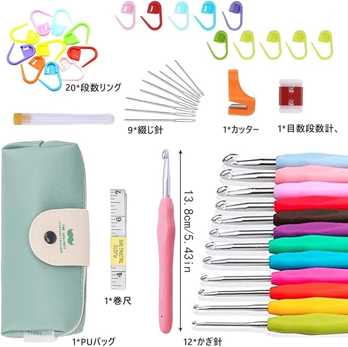【45点セット内容】12*かぎ針、20*段数リング、1*巻尺、1*カッター、1*PUバッグ、1*目数段数計、9*綴じ針(12本カギ針サイズ:2.0mm 、2.5mm、3.0mm、3.5mm、4.0mm、4.5mm、 5.0mm、 5.5mm、 6.0mm、6.5mm、 7.0mm、 8.0mm)