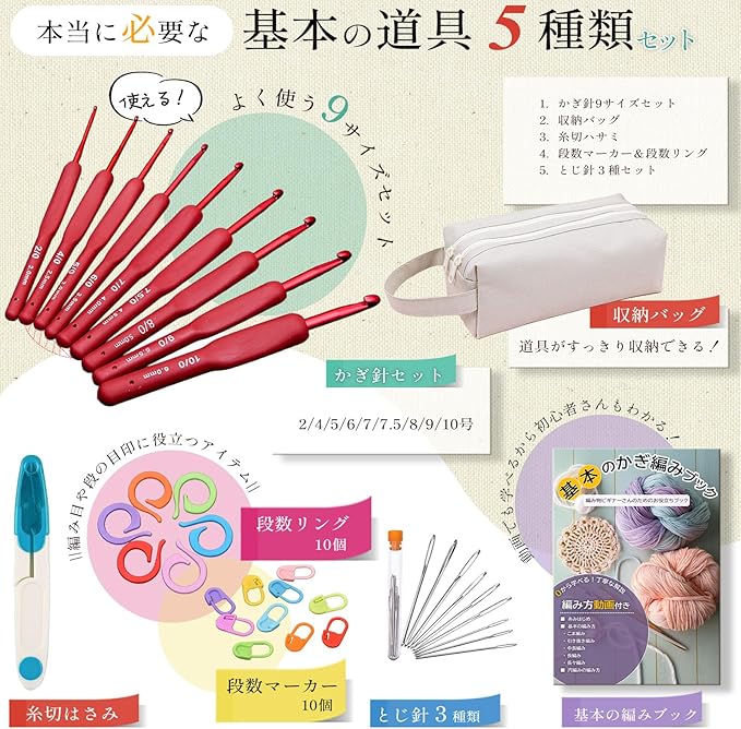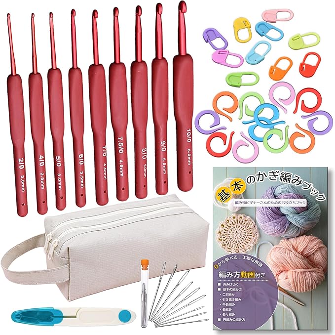 【セット内容】■ かぎ針:9本(サイズ:2 / 3 / 4 / 5 / 6 / 7 / 8 / 9 / 10)■ 段目マーカー:10個 ■ 段目リング:10個 ■ 糸切はさみ: 1個 ■ とじ針セット ■ 収納バッグ: 1個 ■ きほんの編み方ミニブック(図解つき)