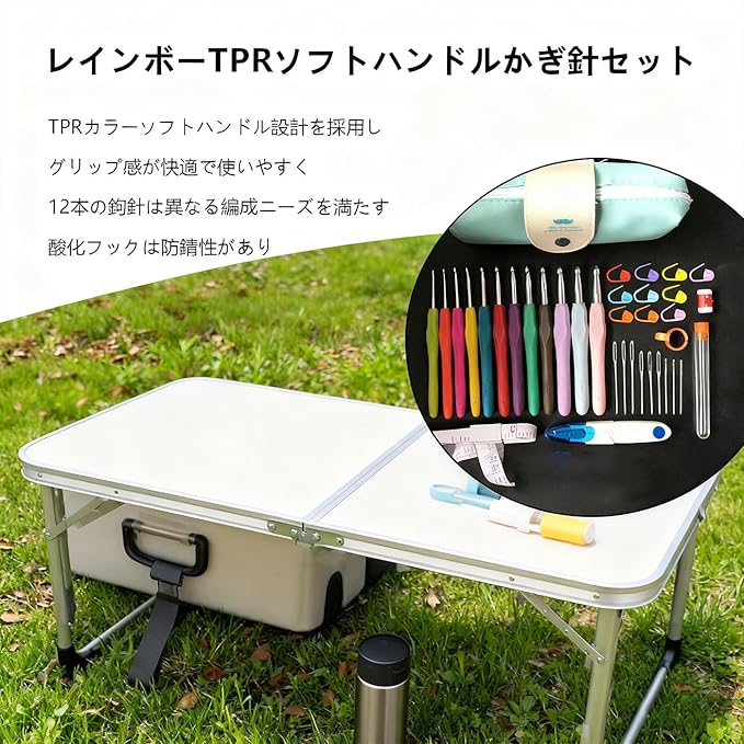 付属コンポーネント 虹熱可塑性ゴムソフト柄かぎ針 (12本), 緑の収納バッグ, 小型カウンタ, 初心者向け編み物の手引き