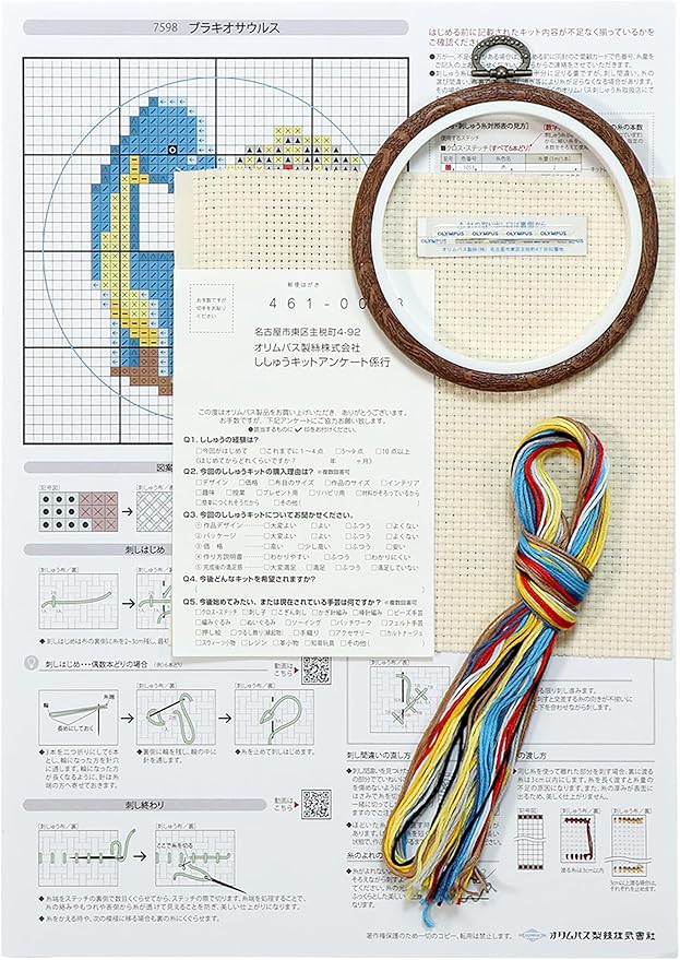 付属コンポーネント 刺しゅう糸、クロス針、カラー図案、説明書、おしゃれフープ、縫い糸、縫い針、はさみ
