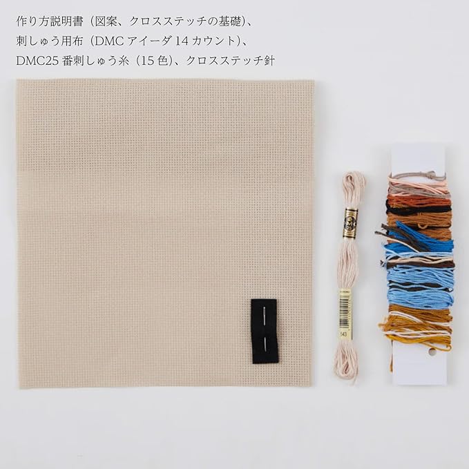 【内容】作り方説明書(図案、クロスステッチの基礎)、刺しゅう用布(DMC14カウント)、DMC25番刺しゅう糸(15色)、クロスステッチ針No.24