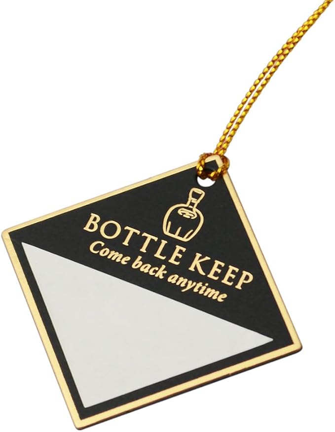 金の紐と金の箔が美しい高級感のあるボトルキープタグです。 紙製なので廃棄にも気を使う事はありません。 白ラベルに名前を書いてから貼るので書き間違えても安心。貼り直しも可能です。(何度も繰り返すと粘着が弱くなります)