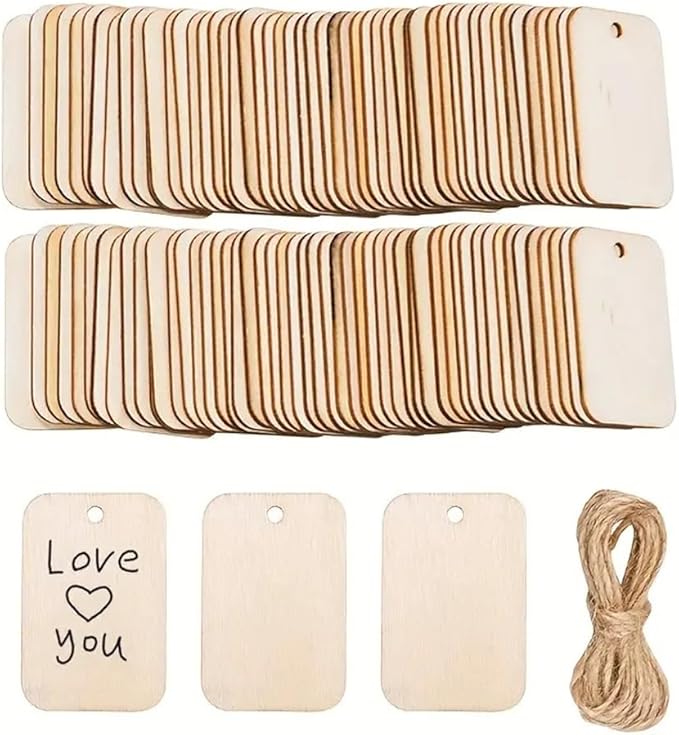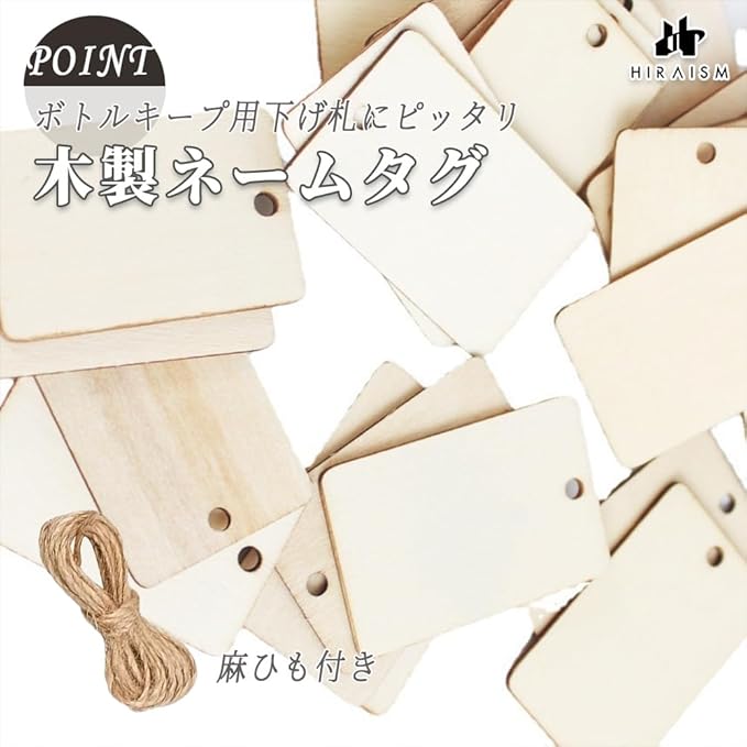 HIRAISM ボトルキープタグ ネームタグ 木製 プレート 52x33mm 長方形 麻ひも付き (100個)