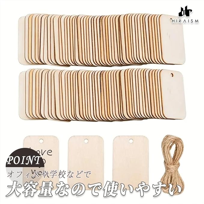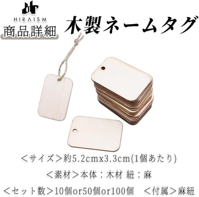 【商品内容】木製ネームタグ <サイズ>約5.2cmx3.3cm(1個あたり) <素材>本体:木材 紐:麻 <セット数>10個or50個or100個 <付属>麻紐