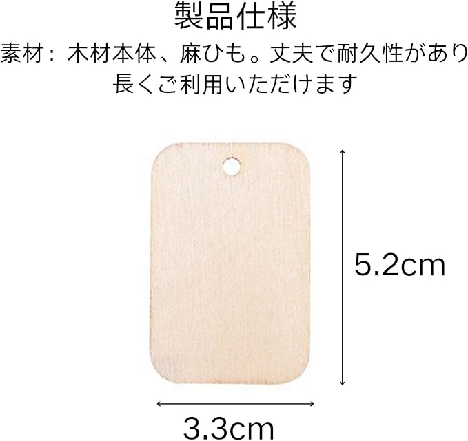 製品仕様:サイズ:5.2㎝ x 3.3cm、素材:木材本体、麻ひも。丈夫で耐久性があり長くご利用いただけます。