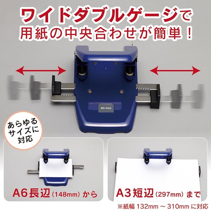 ワイドダブルゲージであらゆるサイズの用紙の中央合わせが簡単にできる使いやすさ抜群の2穴パンチです。