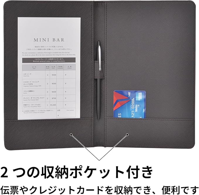 高級感のあるレザー調のスリムでコンパクトな伝票ホルダーです。耐久性に優れた高品質の素材を使用し、長期間の使用に耐えうる頑丈な作りとなっています。スタイリッシュでシンプルなデザインは、どんな場面でも上品な印象を与えます。フロントやレストラン、ミニバーなどの伝票ホルダーとしてご利用いただけます。