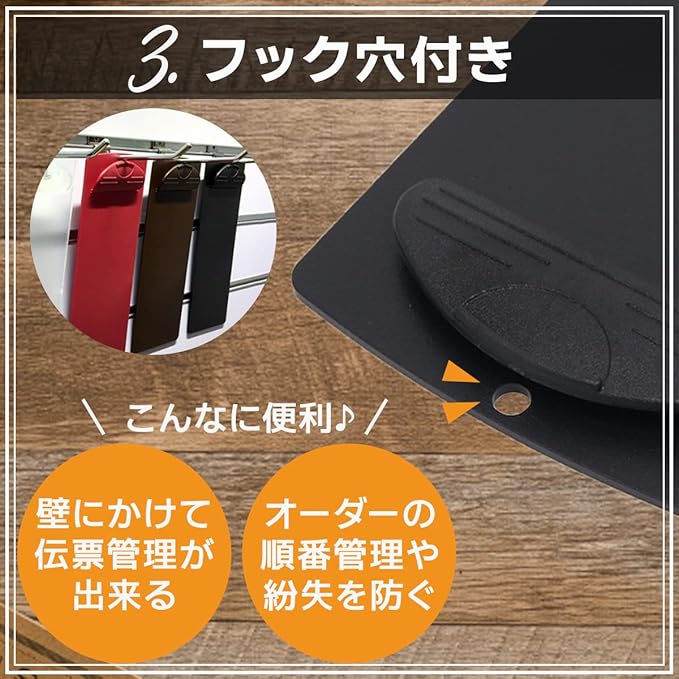 【フック穴付き】クリップボードの上部にフック穴が付いているので壁にかけて伝票管理が出来ます。オフィスでの伝票の紛失や破損等を防く為の、伝票クリップボードとしてお使い頂けます。