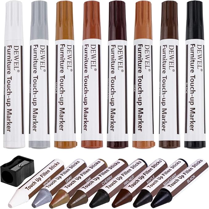 DEWEL フローリング補修 床/ドア補修 傷 穴 塗装剥がれ補修 キズ消し キズ隠し 木製家具補修セット 家具補修マーカー 補修ペン 補修棒 8色入り 16本セット 芯削り器付き